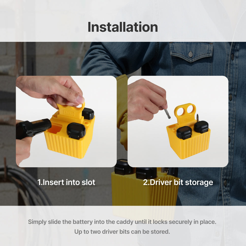 Using the caddy is straightforward: simply slide the battery into the designated slot until it locks securely. This design promotes quick access to your batteries , enhancing your workflow.