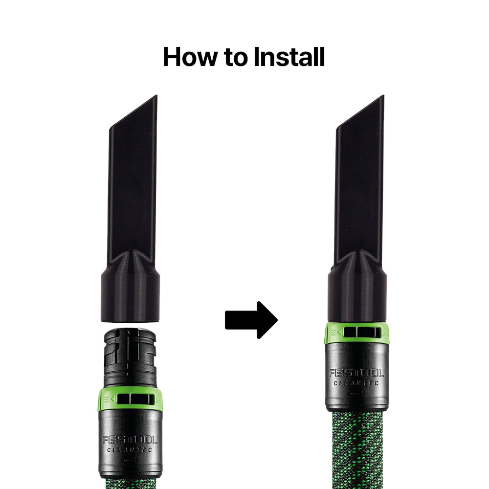 Simply attach the nozzle to any 35mm Festool hose until it clicks into place, ensuring a secure and airtight fit for immediate use.