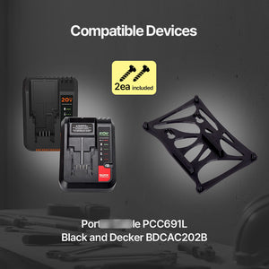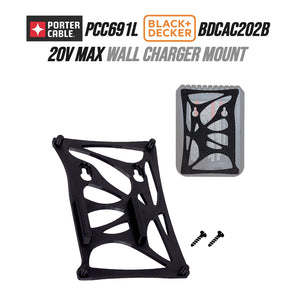 This wall charger mount is specifically designed to fit the Porter Cable PCC691L and Black & Decker BDCAC202B chargers, ensuring a secure and precise fit.