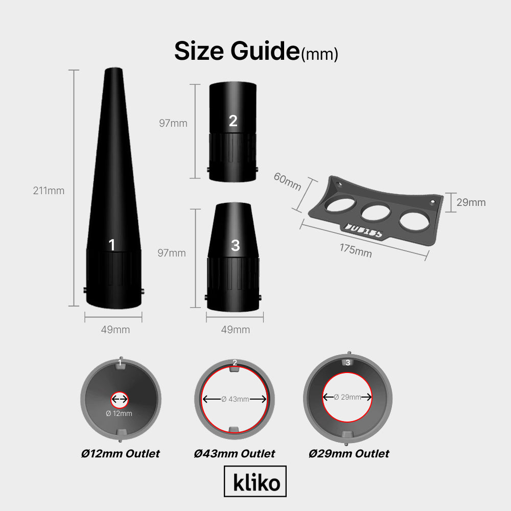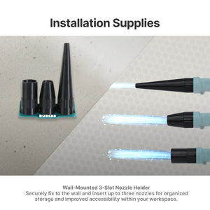 Constructed from durable materials, the nozzles are built to withstand repeated professional and workshop use while remaining lightweight for comfortable handling. The dedicated wall mount holder is designed to neatly store all three nozzles in one place, preventing misplacement and improving workflow organization.